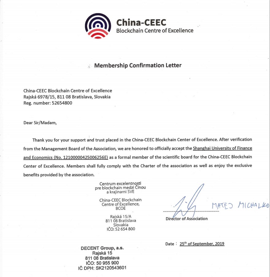 2019年9月25日,我校正式成为由斯洛伐克牵头设立“中国—中东欧(17+1)区块链卓越中心”成员。2019年8月28日“中国-中东欧区块链卓越中心秘书处”在北京成立,2019年9月25日我校金融科技研究院受邀正式加入“中国-中东欧区块链卓越中心”共同体。